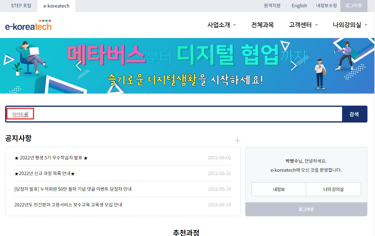 e-koreatech에서 라이트룸을 검색하면 라이트룸 강의가 1개 검색됩니다.