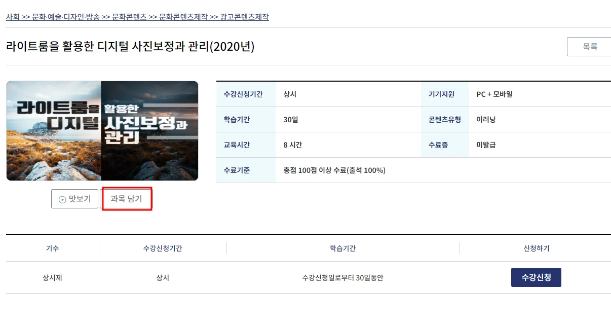 강의명은 '라이트룸을 활용한 디지털 사진보정과 관리'입니다. 2개가 나오는데 한 개는 정규로 6월 15일부터 7월 14일까지 진행되는 것이고 바로 수강하고 싶으면 즉시 수강을 선택하면 됩니다. 어차피 수료증 주는 강의가 아니니 즉시 수강을 눌러서 강의 들어보세요.
