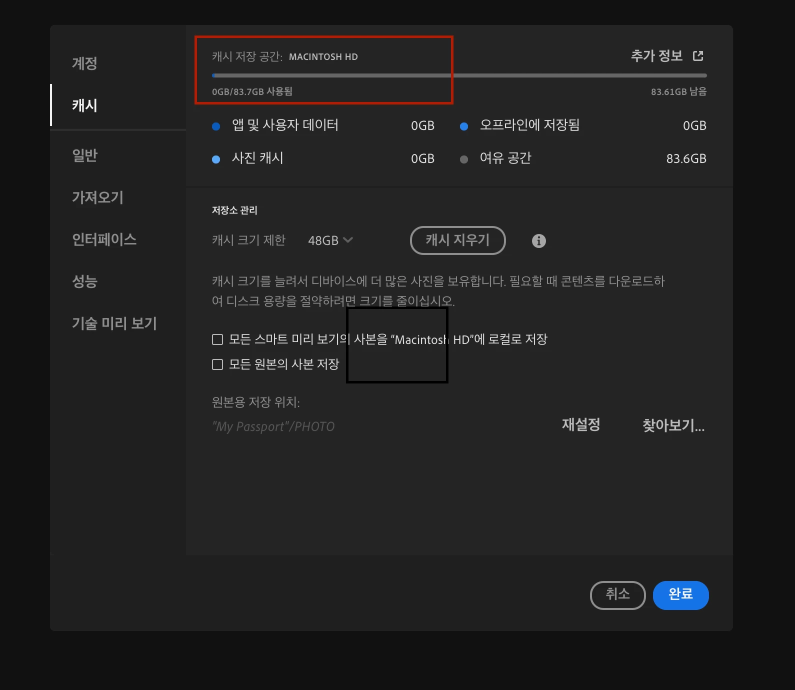 캐시 저장 공간을 변경할수는 없나요 ? 외장 ssd로 바꾸고 싶어서요