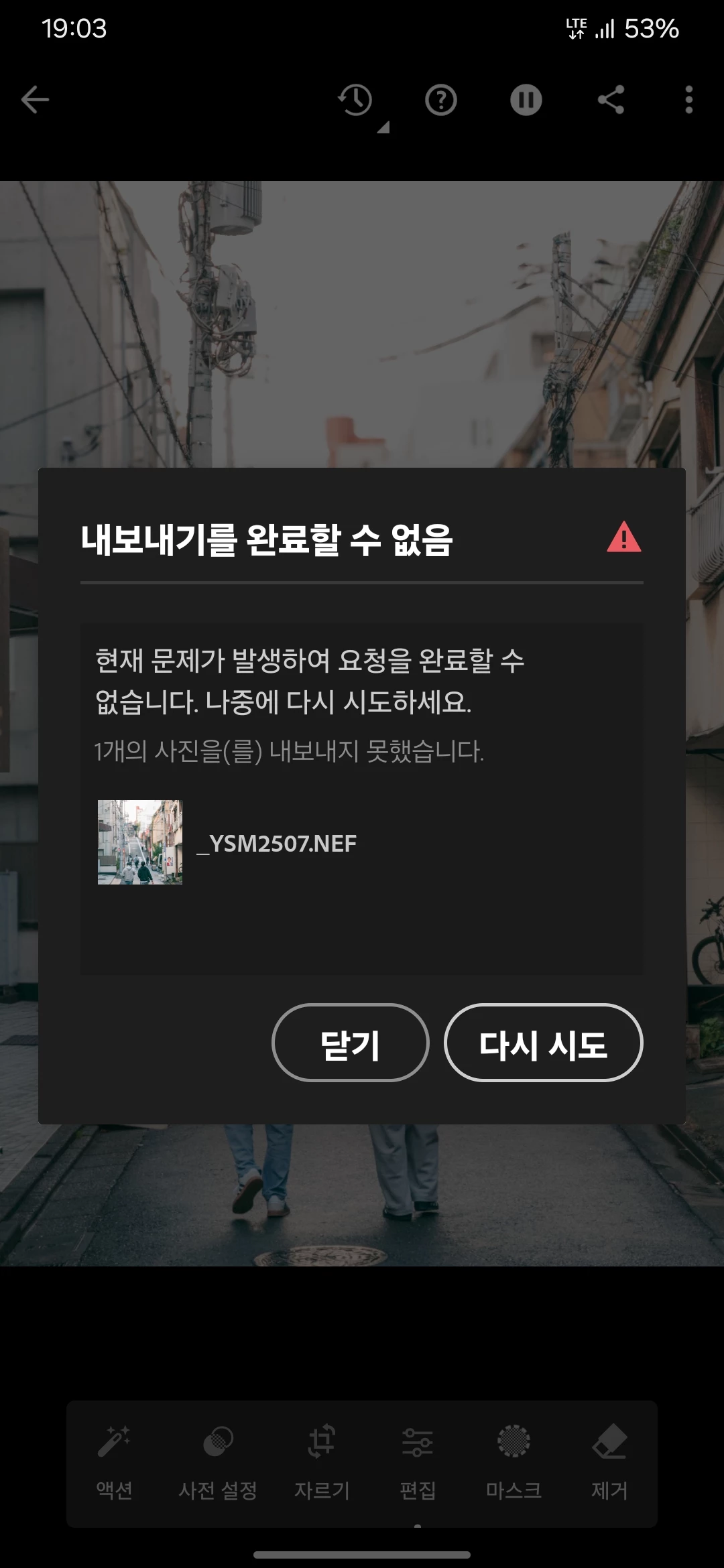 모든 사진에서 발생되는 문제인가요? 아니면 특정 파일에 대한 내보내기시 발생되는 안내인가요?