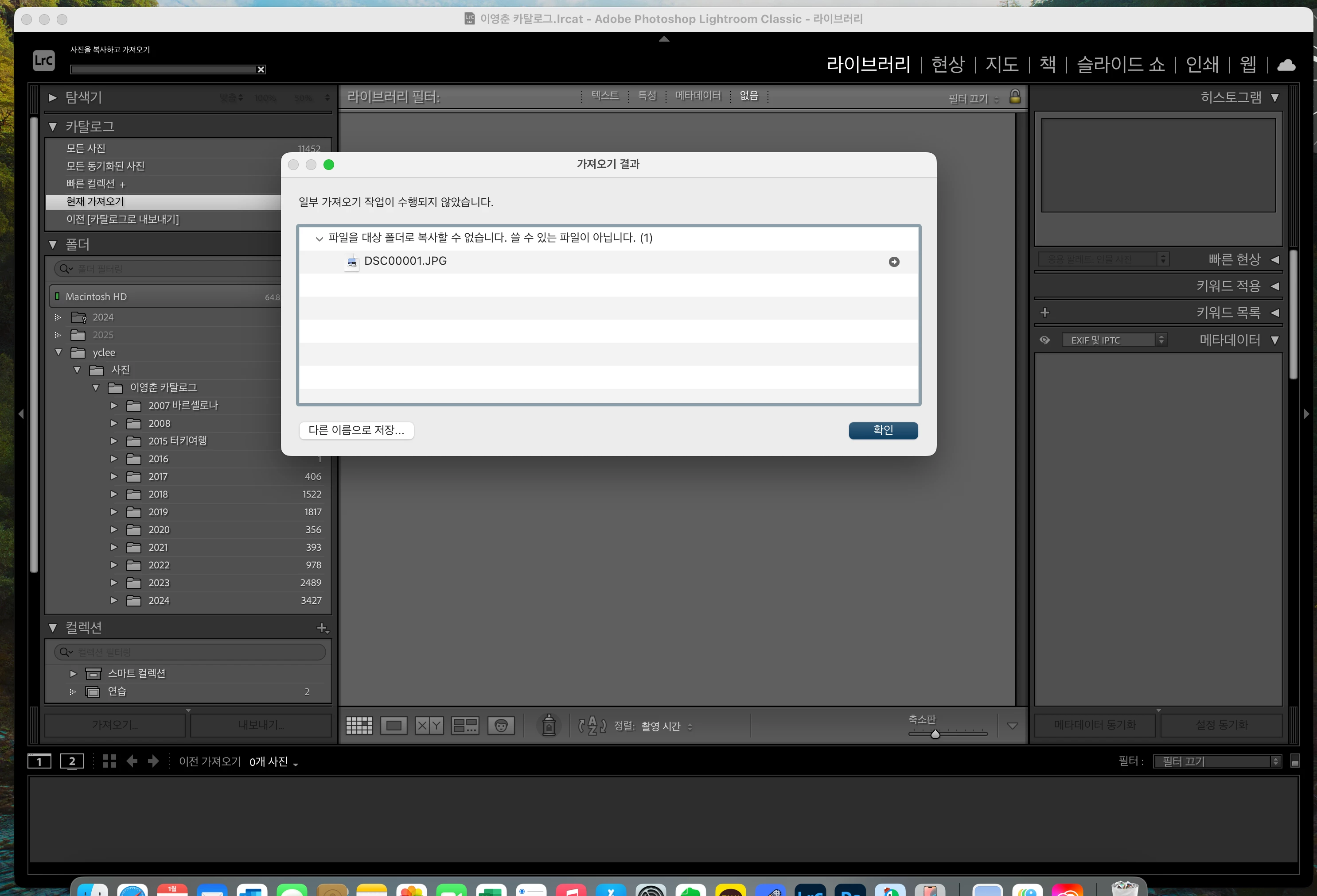 아이맥에서 라이트룸 클래식을 사용하고 있습니다. 지금까지는 사용에 문제가 없었는데, 얼마전 카메라를 바꾸고 나서 사진을 가져와서 저장하려고하니 “파일을 대상폴더로 복사할수 없습니다. 쓸수있는 파일이 아닙니다.” 라는 메세지가 뜨고 저장이 안됩니다. 사진파일의 종류는 JPEG, RAW file 모두다 저장할 수가 없습니다.