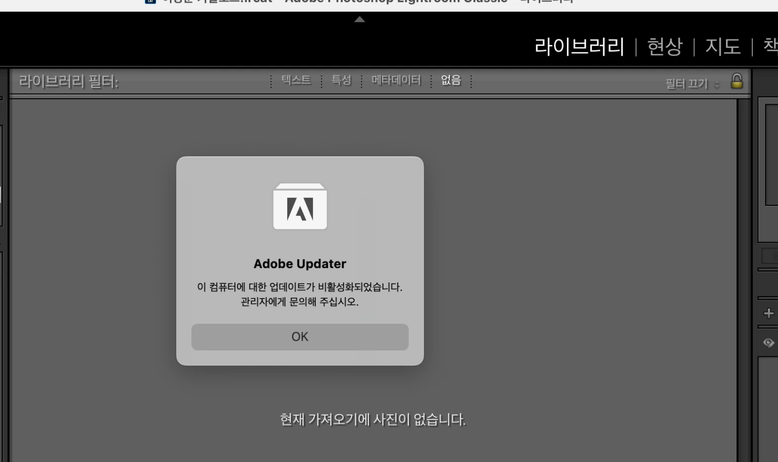 그래서 adobe update 를 하였는데 업데이드 되지않고, 아래와 같이 “이컴퓨터에 대한 업데이트가 비활성화 되었으니 관리자에게 문의하십시요”라고 메세지가 뜹니다.