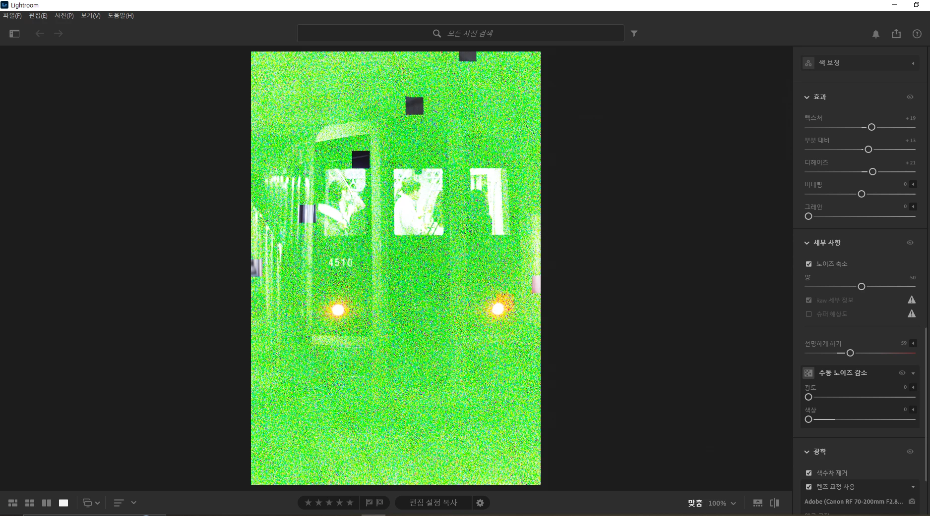 라이트룸 8.3 버전부터 CR3 파일에 AI 노이즈제거를 적용할 경우 이미지와 같이 깨지는 현상이 발생합니다