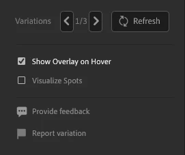 이제 Lightroom에서 FireFly를 사용하여 선택할 수 있는 세 가지 변형이 개발됩니다. 새로 고침을 클릭하여 세 가지 새로운 변형을 개발할 수 있습니다. 생성형 제거에 대한 피드백을 제공할 수 있습니다.
