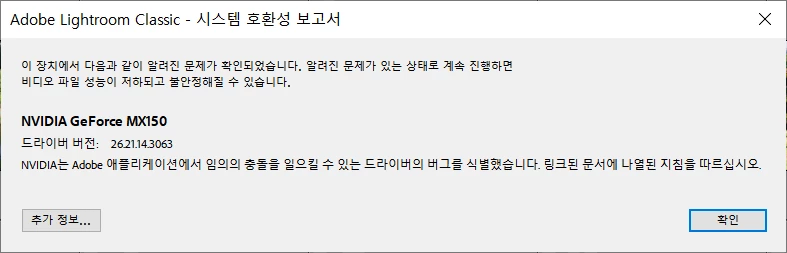 내장형 GeForce MX150 사용 경우 시스템 호환성 알림 해결이 발생합니다.