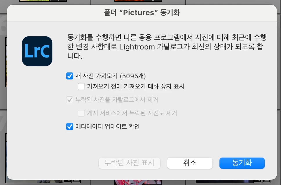 라이트룸에서 계속 없는 사진을 동기화하려고 합니다.