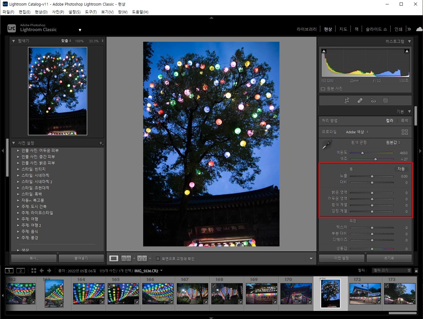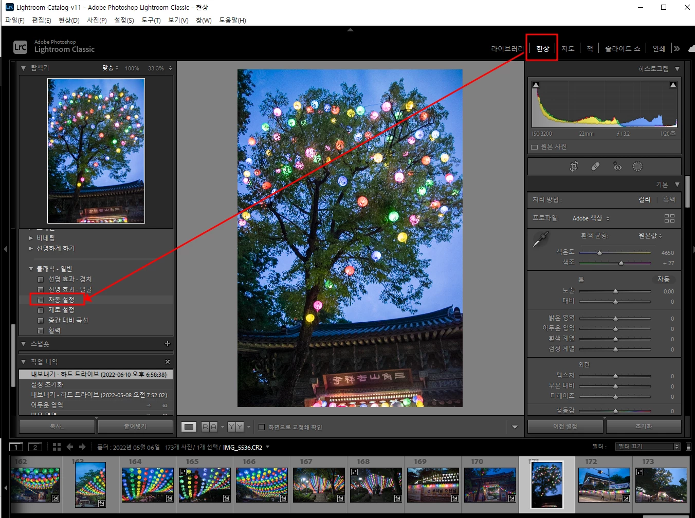 먼저 현상 메뉴에서 왼쪽 중간에 있는 프리셋 중에 클래식-일반 카테고리에 있는 자동설정을 눌러줘도 되고 안 눌러도 됩니다. 자동 설정으로도 꽤 마음에 드는 사진을 만들어주긴 합니다.