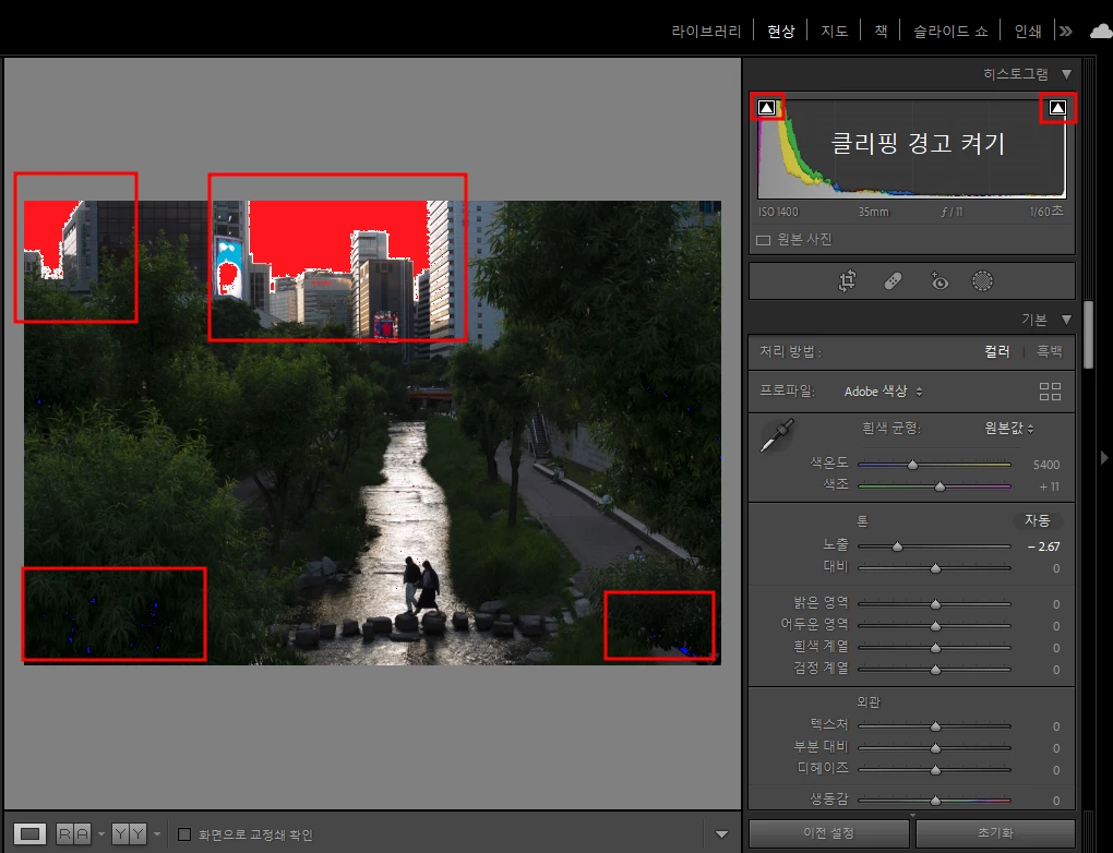 노출, 밝은영역, 어두운영역 조절할 때 ALT를 누르고 슬라이드를 조절해도 되지만 아예 상단 히스토그램에 있는 양쪽 끝에 위로 향한 화살표 ▲를 클릭하면 클리핑 경고 기능이 켜집니다. 그럼 사진에서 너무 밝은 곳, 너무 어두워서 구분이 안 가는 곳에 빨간색(노출과다), 파란색(노출부족) 영역이 나옵니다. 잘 모르겠으면 이 파란색, 빨간색만 안 보이게 후보정을 해도 됩니다. 다시 말씀드리지만 이건 어디까지나 참고이지 눈으로 보면서 직접 보정 강도를 조절하는 것이 가장 좋습니다.