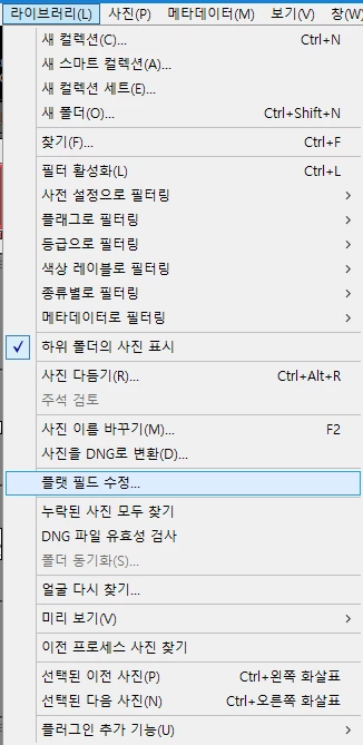 라이트룸 클래식의 라이브러리 메뉴에 있는 '플랫 필드 수정' 기능을 사용하려고 합니다.