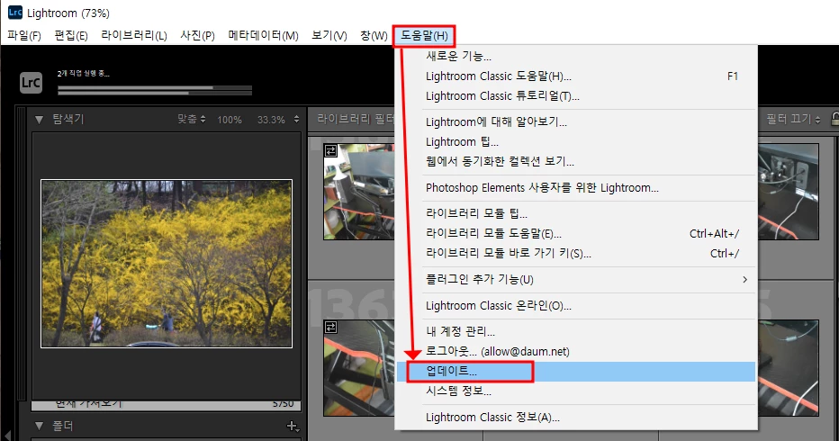 업데이트는 라이트룸 클래식을 실행 후에 도움말 >> 업데이트를 눌러서 진행하시면 됩니다.