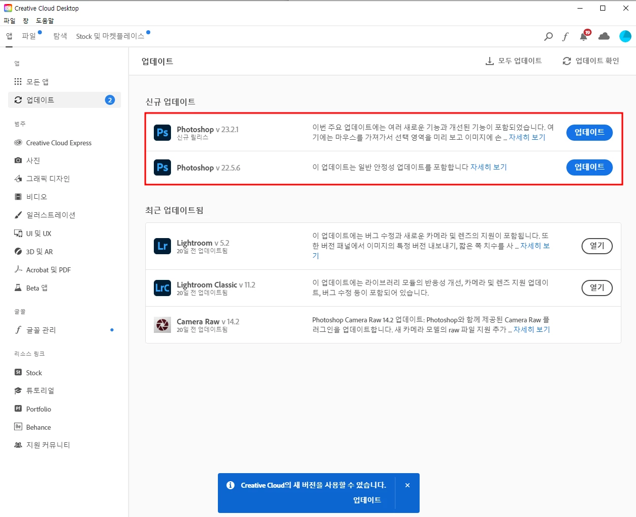 업데이트를 누르면 위와 같은 창이 뜨는데 신규 업데이트는 파란색 업데이트 버튼을 눌러서 진행하면 됩니다.