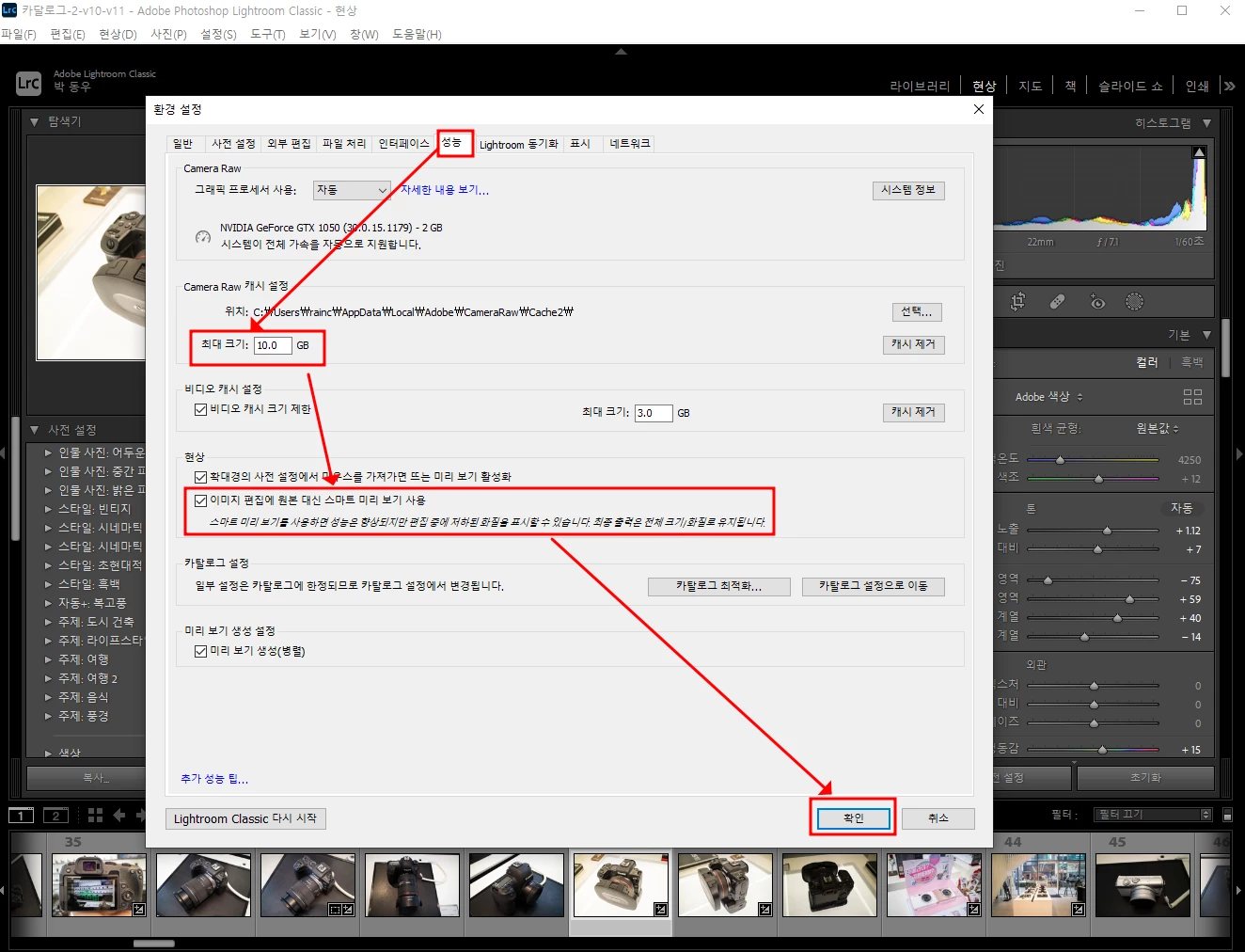라이트룸 클래식에서 카탈로그 파일과 함께 라이브러리 모드에서 사용되는 미리보기 사진 파일이나 편집할 때 고품질 미리보기를 만드는데 이 미리보기 사진을 저장하는 데 사용하는 카메라 RAW 캐시가 있습니다. 기본은 1~5GB로 되어 있는데 이걸 10GB 이상으로 올려주세요. 어떤 분은 30GB까지 올리더라고요. 쉽게 말해서 사진을 요리할 때 좀 더 큰 도마에 올려놓고 요리를 할 수 있어서 쾌적한 사진 보정을 할 수 있습니다.