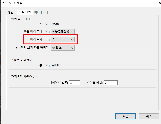 카달로그 설정 >> 파일처리에 가면 미리보기 사진 품질이 있는데 이걸 중으로 해놓으면 좀 더 작은 용량의 사진으로 미리 볼 수 있어서 라이트룸 속도 증가에 도움이 됩니다.