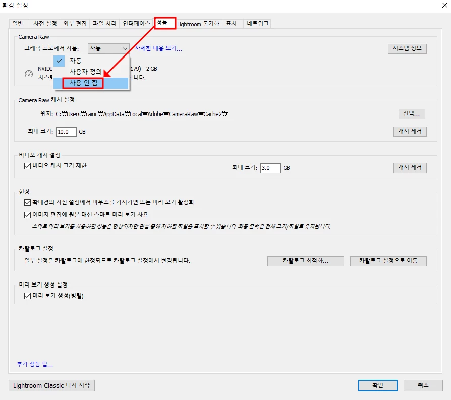 4. 라이트룸 카탈로그나 카메라 RAW 캐시 저장 드라이브 용량 체크