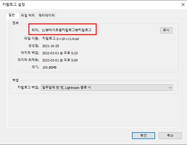 라이트룸 카달로그 저장 위치는 편집 >> 카달로그 설정 >> 일반에 있습니다.