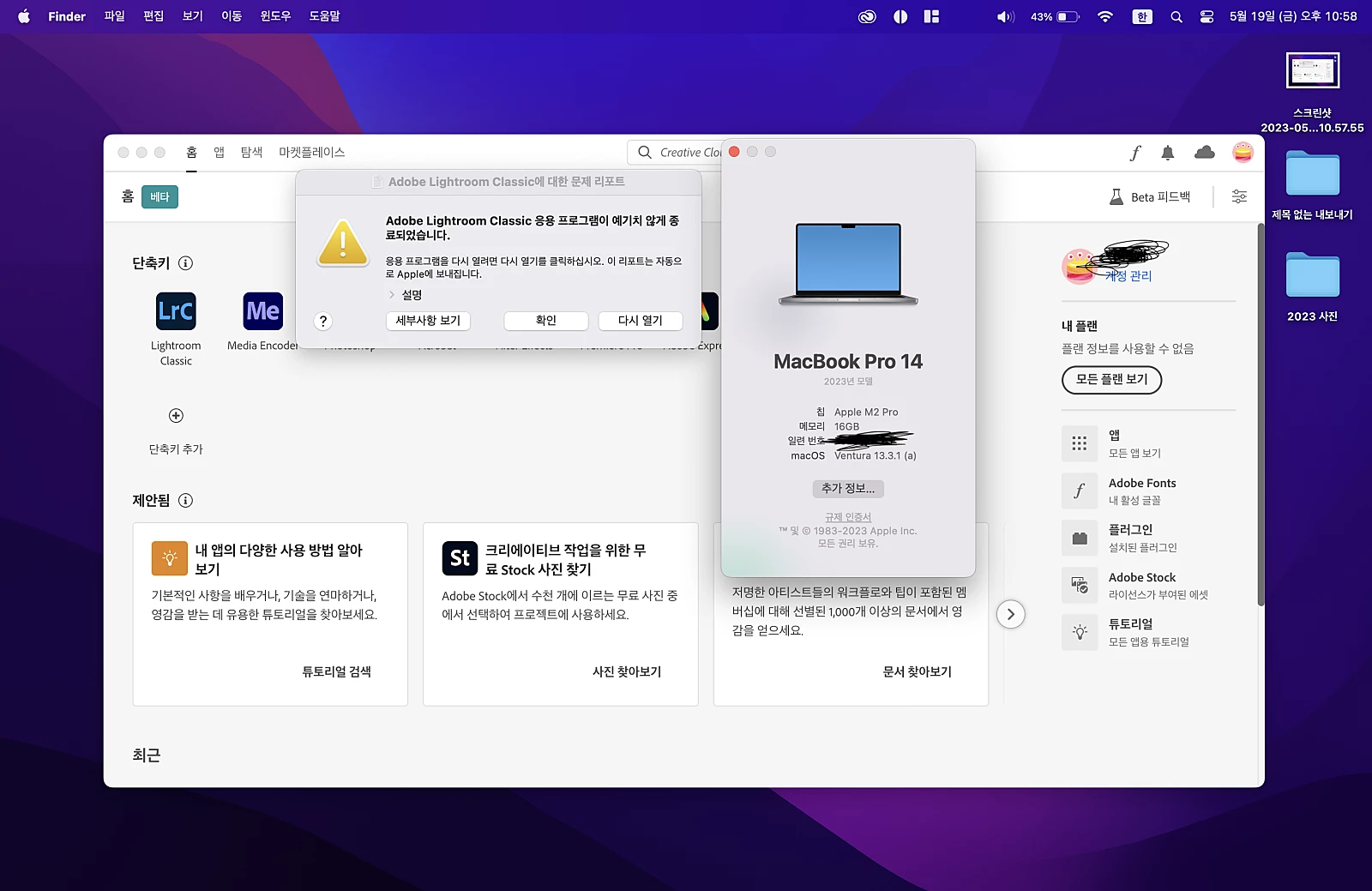 추가로 설명하면 다른 프로그램들(프리미어 프로, 애프터 이펙트, 심지어 그냥 라이트룸까지)은 모두 잘 실행됩니다.