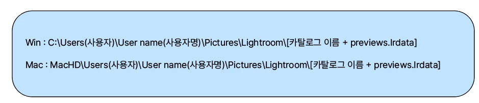 아래경로의 previews.db와 root-pixels.db를 삭제하고 라이트룸을 재실행하세요