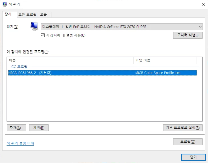 색문제 인가 싶어 각 모니터별 sRGB 지정해줬지만 문제해결이 되지않고 있습니다.