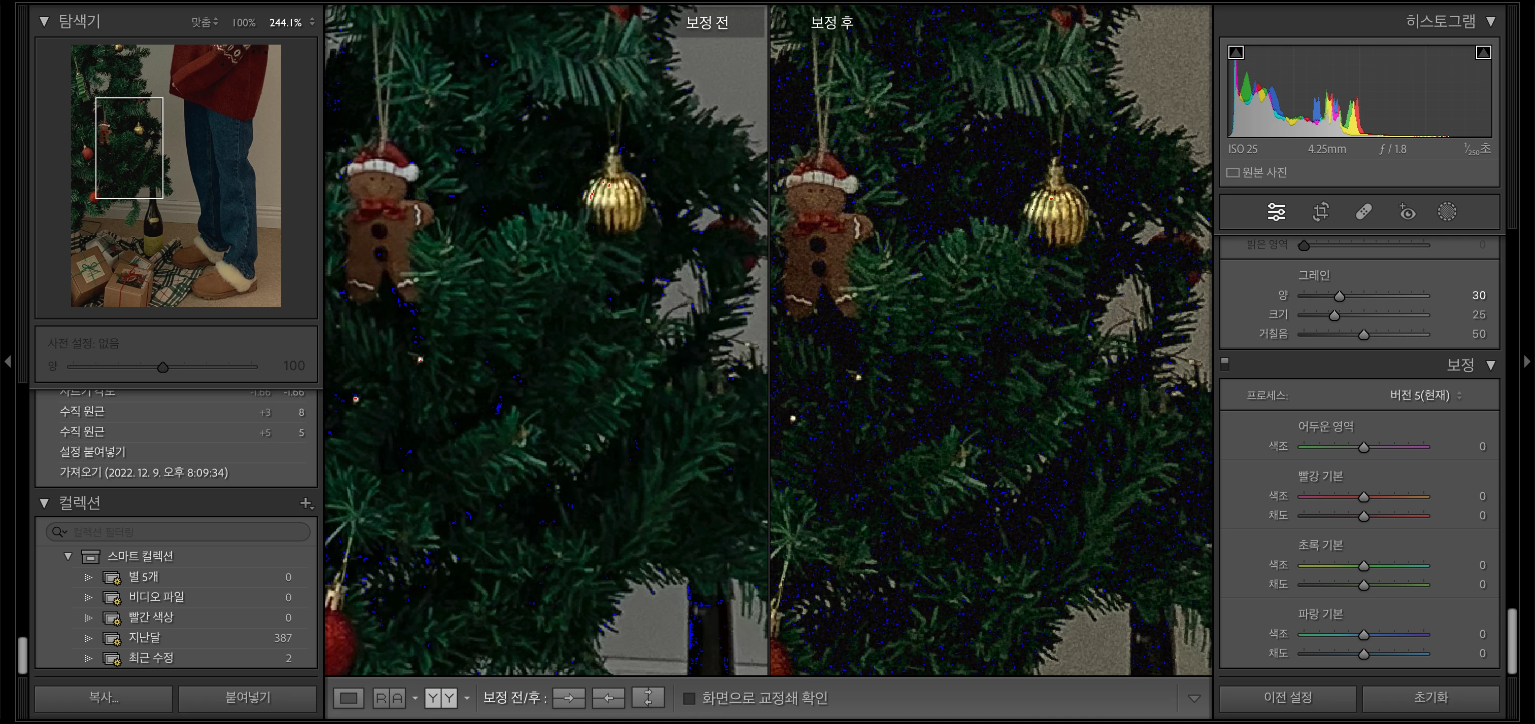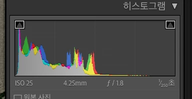 노출도를 확인 할 수 있는 히스토그램이 활성화 되어 있다면 파란 계열 또는 붉은 계열의 노출도를 확인 할 수 있습니다.