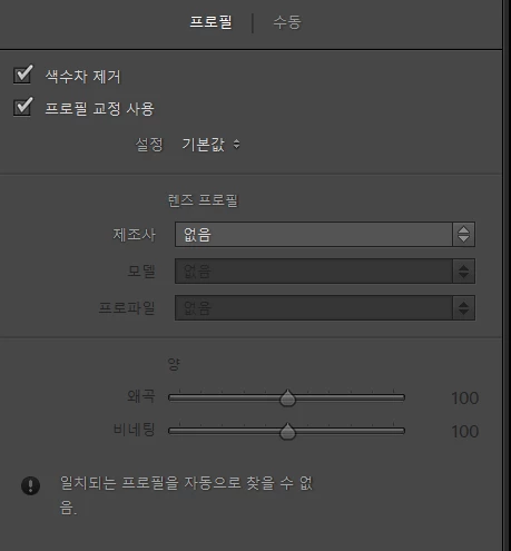 라이트룸 클래식을 재 설치한 후에.. 현상 모듈에서 프로필 사용교정기능을 체크하면, 일치되는 프로필을 자동으로 찾을 수 없음"이라는 에러메세지가 나타납니다. 재 설치 전 사진의 프로필 사용교정을 체크하면 정상적으로 카메라와 렌즈의 프로필이 적용됩니다. 재 설치 이후에 불러온 사진들은 일치된 프로필을 자동으로 찾을 수 없다고 합니다.