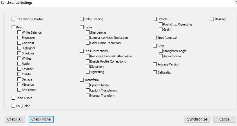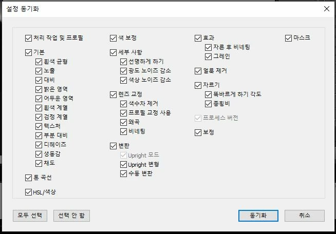 사진의 설정 값을 다른 사진과 동기화할 때 노출만 자주 동기화되지 않습니다. 다른 설정은 동기화되지만 노출 없이 동기화됩니다.