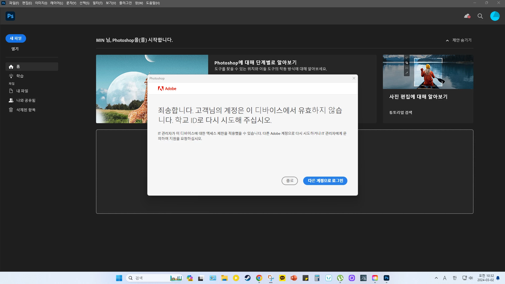 MMIN35811214gwanParticipantForum|Forum|1 year agoMarch 2, 2024질문계정 변경 불가 문제Forum|Forum|1 year agoMarch 2, 20241 답변51 조회조직의 요금제가 변경되어개인 계정으로 변경하여 결제하였으나동일한 메세지가 계속 뜨면서 포토샵을 이용할 수 가 없습니다빠른 조치 부탁드립니다