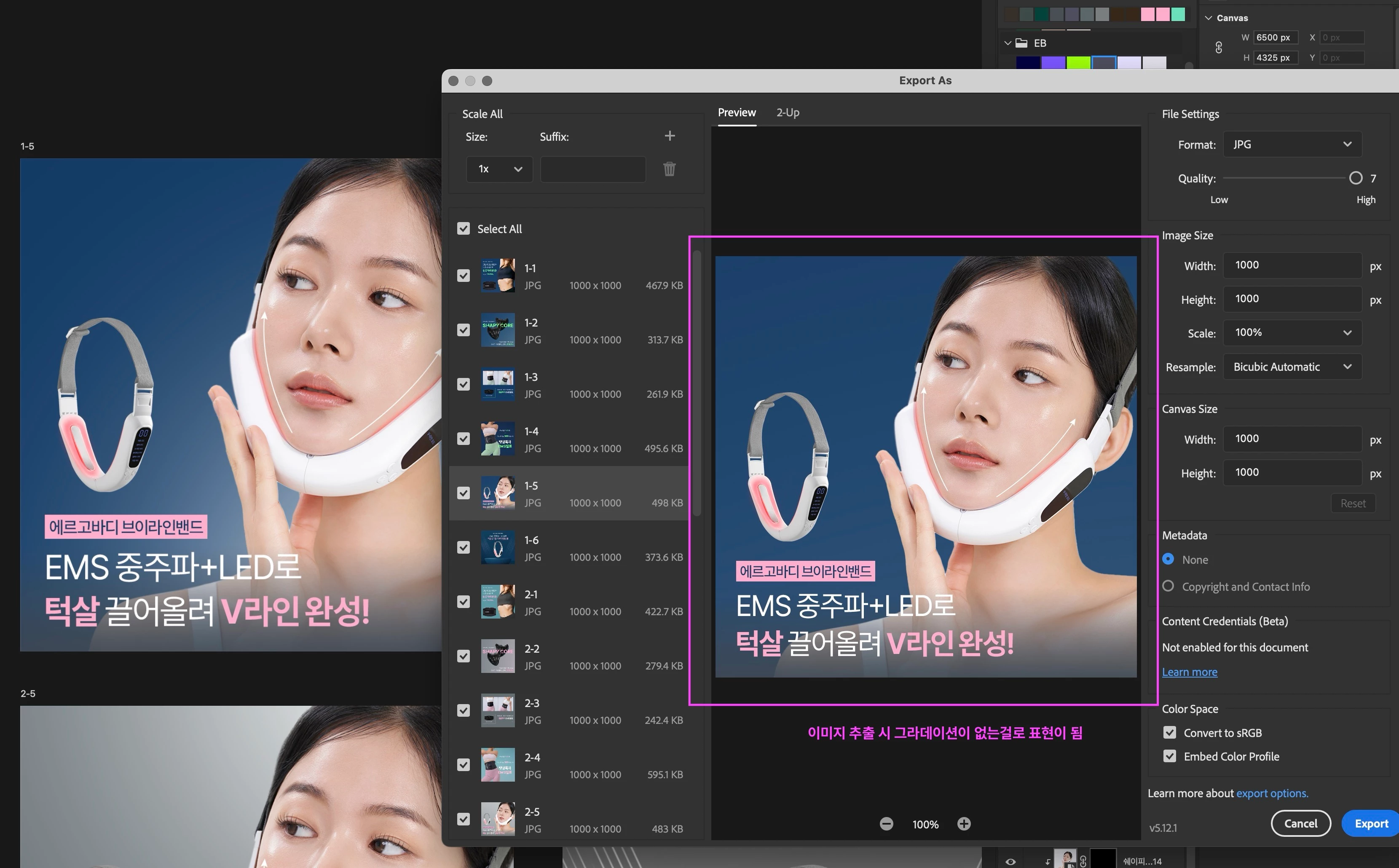 그라디언트 적용된 이미지의 내보내기에는 문제가 없어서 한번 이전 버전의 포토샵에서도 테스트를 진행해 볼 수 있겠습니다.