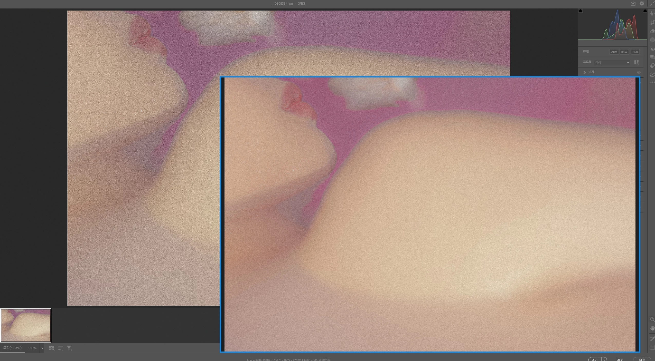 색공간과 색프로필 설정이 sRGB또는 Adobe RGB로 되어 있으실까요?