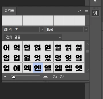 계속해서 작업할 때 글리프 창이 나옵니다.