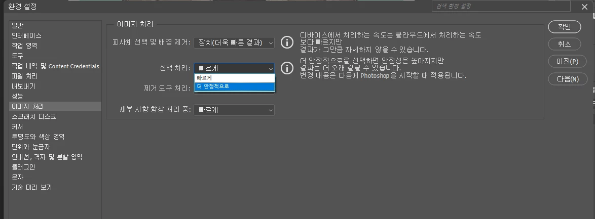 3. 혹 해당 기능만 사용할때마다 튕기는 경우 더 안정적으로 환경설정을 바꿔서 시도