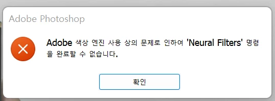 포토샵에서 뉴럴필터의 강력한 확대/축소 기능(픽셀 늘리기)를 사용하려는데 다 적용하고 확인을 누르면 이렇게 뜨면서 사용이 안됩니다. 색상엔진 사용 상의 문제가 뭘까요..