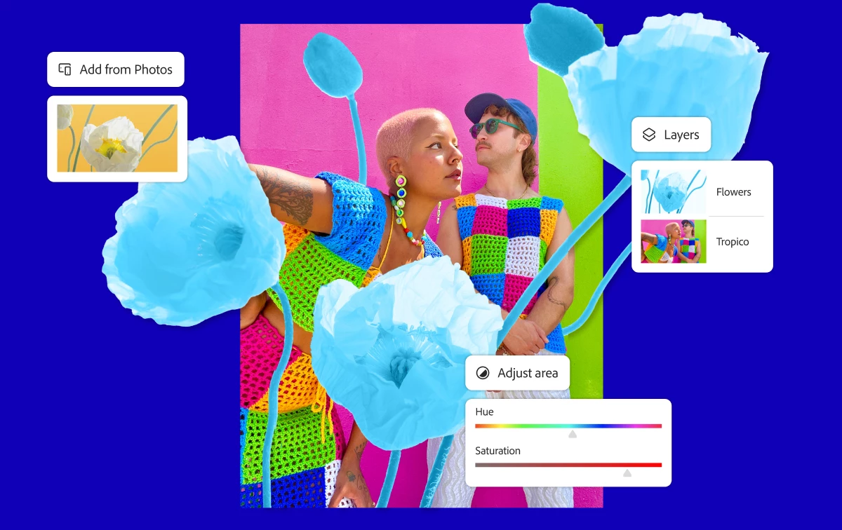 사진과 Adobe Stock 이미지, 그래픽, 텍스트 등을 혼합하여 매력적인 비주얼을 만들 수 있습니다.
