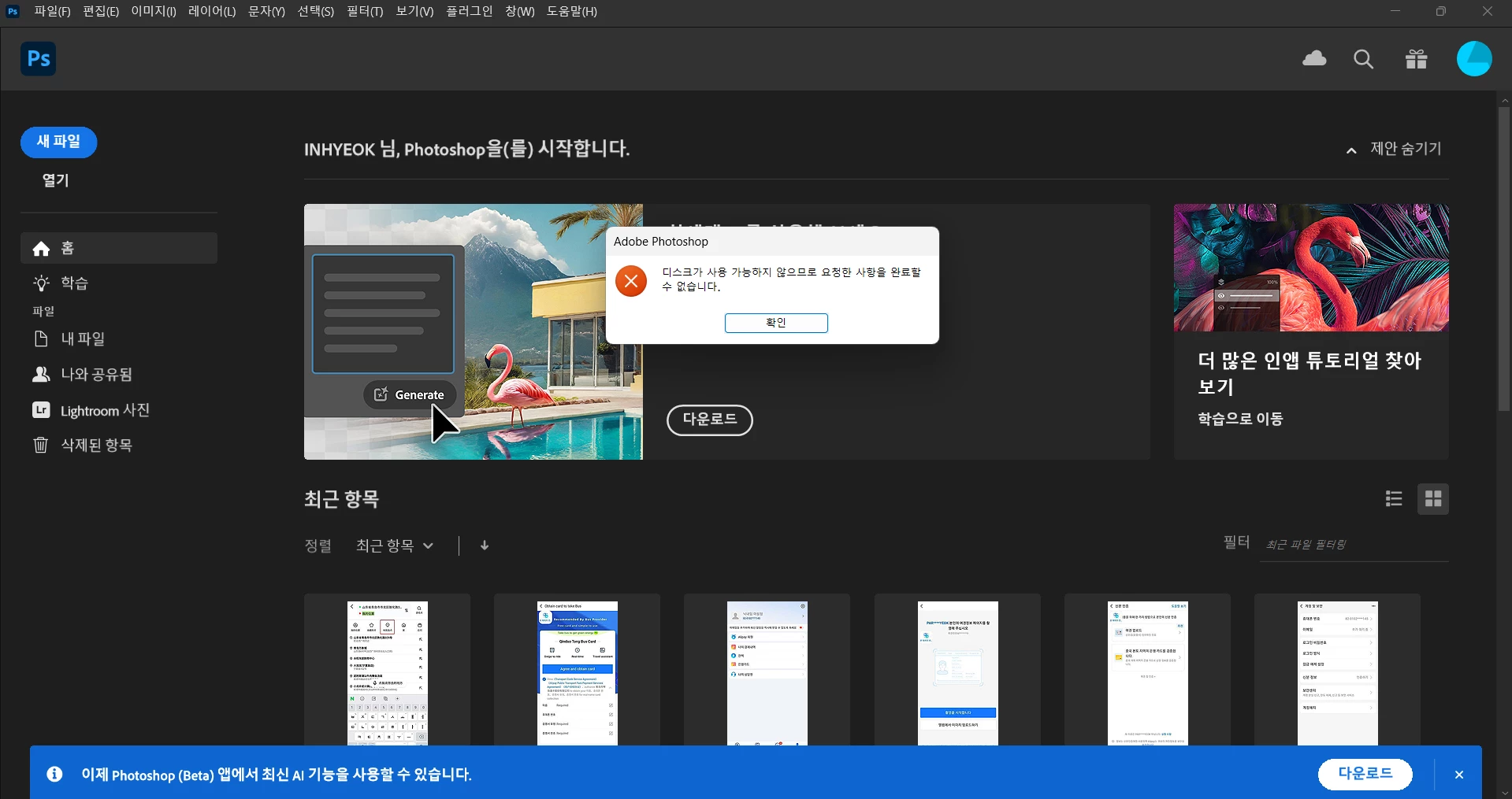 브릿지에서 미리보기가 뜨지 않고, CAMERA RAW로 열었을 때 '디스크가 사용 가능하지 않으므로 요청한 사항을 완료할 수 없습니다'라는 메세지가 뜹니다.