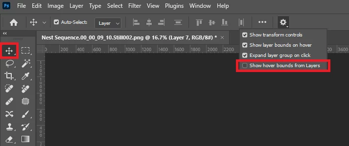 이동 툴을 선택한 상태에서, 위의 스크린 캡쳐본 처럼 톱니바퀴를 누르면 해당 옵션 끄는 기능이 있습니다.
