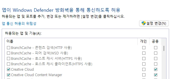 방화벽에서는 creative cloud가 추가되어있는 상태입니다