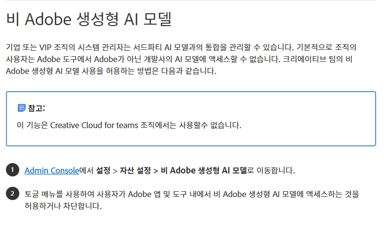제공해주신 이미지 확인시, 고객님께서 구독중이신 플랜의 종류는 Teams(기업형)플랜이실 것으로 사료됩니다. 기업형 플랜에서는 비 adobe 생성형 AI모델을 사용하기 위해서 별도의 플랜의 관리자의 사용 승인이 필요합니다.