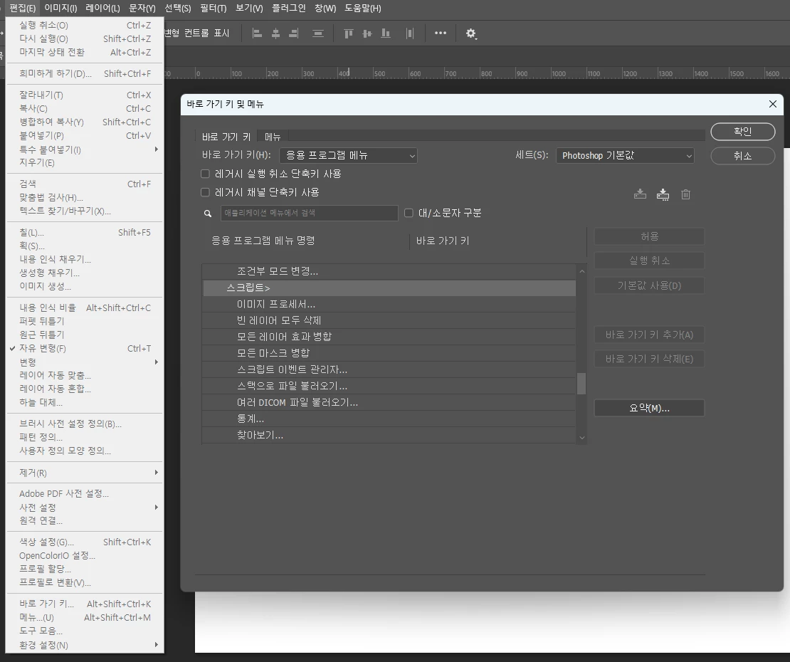 편집 > 바로가기키 메뉴를 눌러 들어간다음 한번 스크립트 메뉴 부분으로 이동해서 해당 단축키가 수동으로 변환이 되는지 확인해 보시겠어요?
