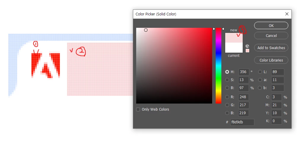 스포이드 설정 중 sample size 를 point sample로 변경하니 해결되었습니다.