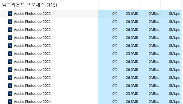 무무하111ParticipantForum|Forum|1 year agoMarch 29, 2024질문어제까지 잘만쓰던 포토샵이 켜지지않습니다.Forum|Forum|1 year agoMarch 29, 20240 답변들23 조회안녕하세요 포토샵 23.3.1버전쓰다가 실행해도 아무창도안뜨고 그냥 씹혀서최신버전을 추가로 설치하여 실행했는데 마찬가지로 씹힙니다. 경고창도 안뜨고요, 그냥 더블클릭 안했던것처럼 아무변화없습니다. 사진처럼 작업관리자에만 백그라운드 프로세스로 쌓이기만 합니다.재설치도 소용없고요 어떡하면 되나요...