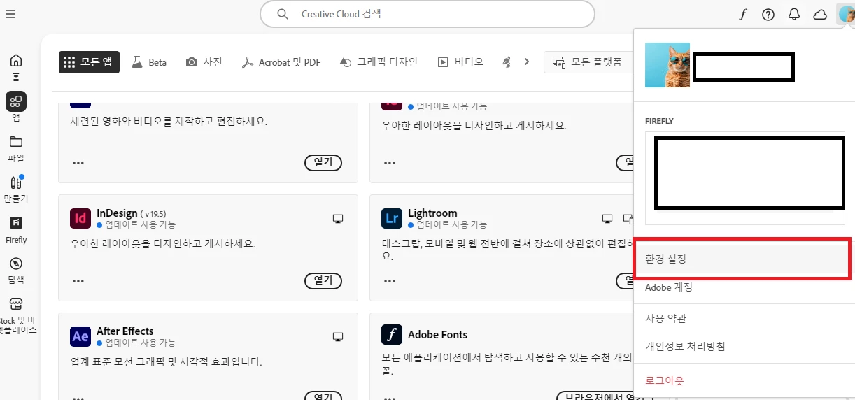 *하단이미지 creative cloud 의 환경설정 들어가는 방법