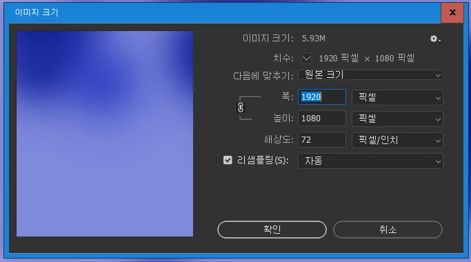 리샘플링을 선택하면, "자동, 세부 묘사 유지, 쌍입방" 등 다양한 옵션에 따라 픽셀 수가 조정됩니다. 각각의 옵션 값에 대한 안내는 여기를 참고해주세요