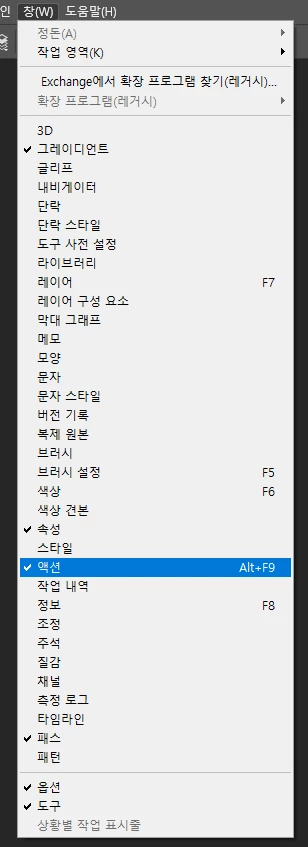 (1) 창>액션 (Alt+F9)을 클릭하여 액션 패널을 불러오세요