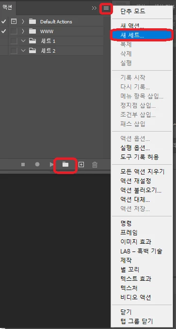 [액션 패널 메뉴] > [새 세트]를 클릭하고