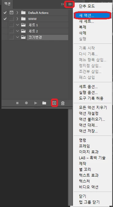 패널 하단에 있는 새 액션 만들기 버튼(+)을 클릭하거나