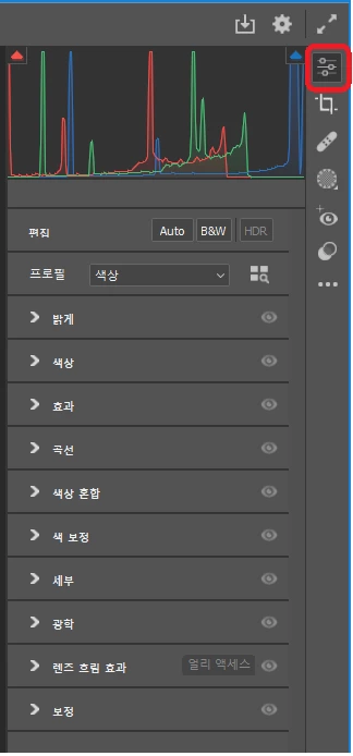 (1) 인터페이스 오른쪽 상단에 있는 슬라이더 아이콘을 클릭하면