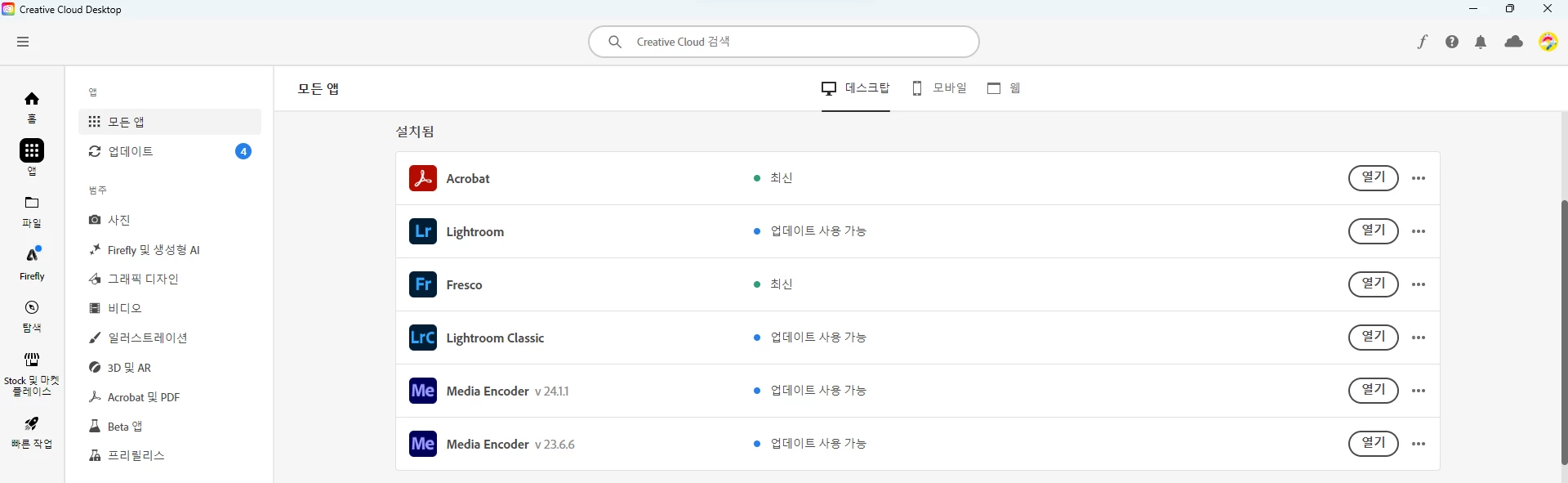 Creative Cloud desktop 앱 탭의 (열기) 버튼으로 열어도 동일한지 확인해 보세요.