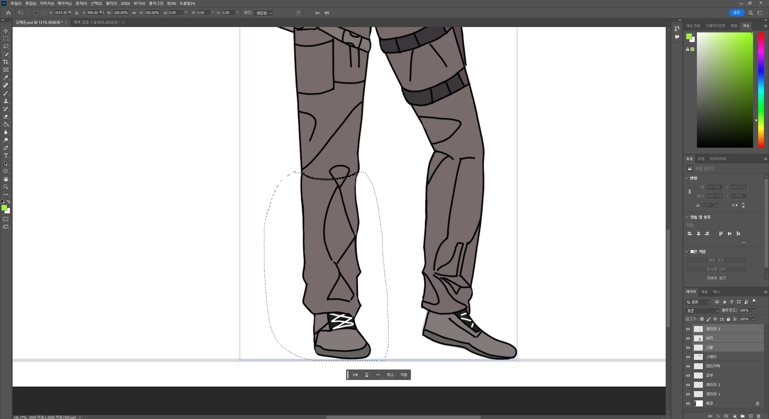 올가미로 지정한 특정부분 자유변형이 안됩니다.