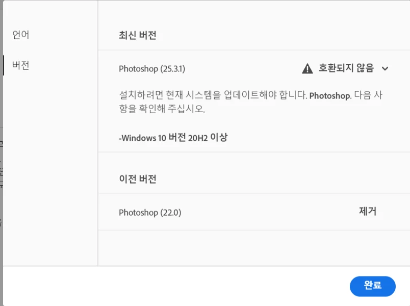 버전 22이상의 다른 버전을 설치할 수도 없습니다. 크리에이티브 클라우드 업데이트도 최신,