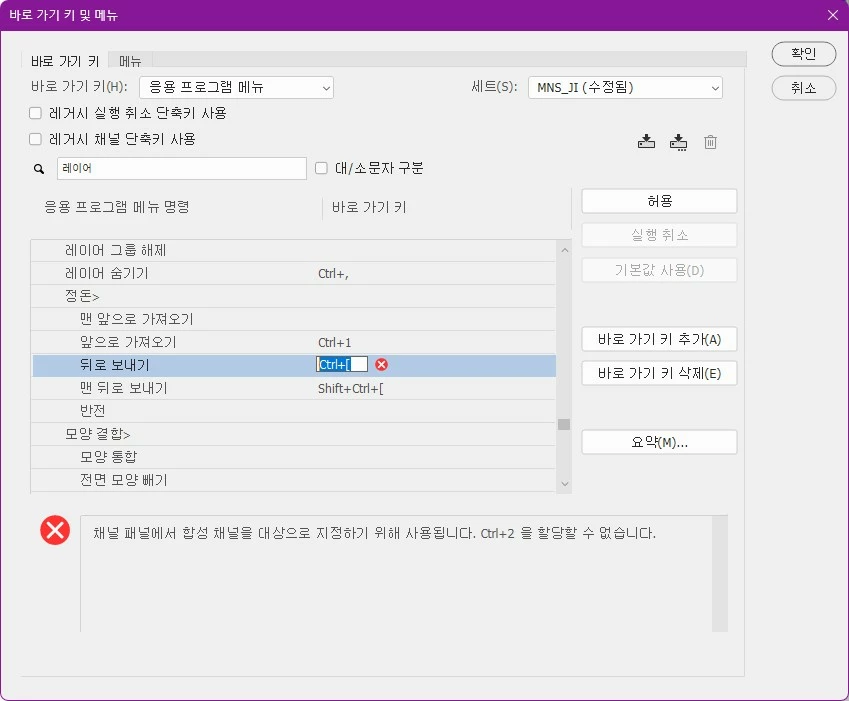 WWhispering_Charm8312ParticipantForum|Forum|1 year agoNovember 4, 2024Answered응용 프로그램 메뉴 바로가기키 삽입 버그의 건Forum|Forum|1 year agoNovember 4, 20241 reply81 views 채널 패널에서 합성 채널을 대상으로 지정하기 위해 사용됩니다. Ctrl+2 을 할당할 수 없습니다. 이 내용을 무시하고 Ctrl+2 (Ctrl+3, Ctrl+4 ...)를 '응용 프로그램 메뉴' 바로 가기 키로 지정할 수 있는 방법을 알려주실 고수분들을 찾습니다. 포토샵 참.. 마이그레이션이 조잡하네요. ㅜ 제가 잘 못하는 건지.. 감사합니다.버그버그 수정일반 문제 해결충돌 또는 작동 중단문제 또는 오류
