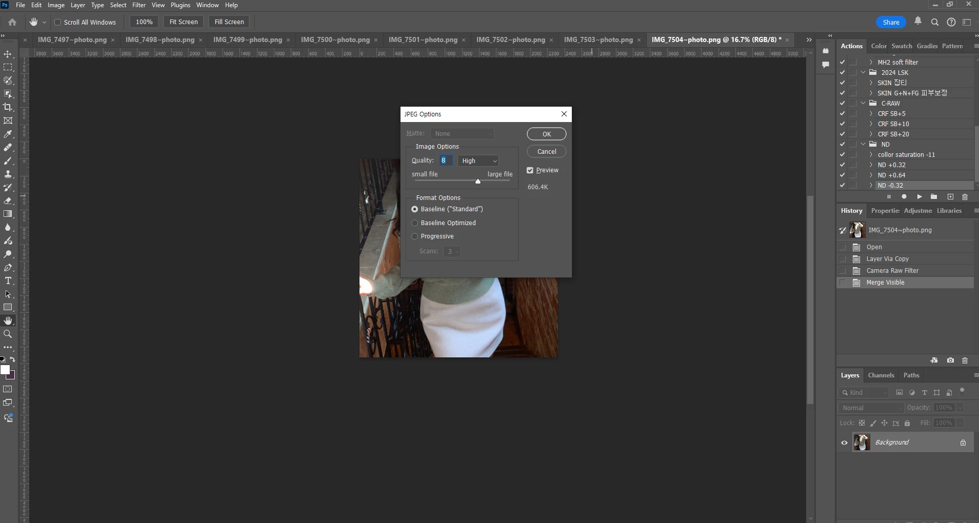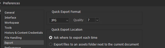 빠른 내보내기 포멧 설정을 JPG로 설정하면 최대 퀄리티 7로 설정할 수 있습니다.